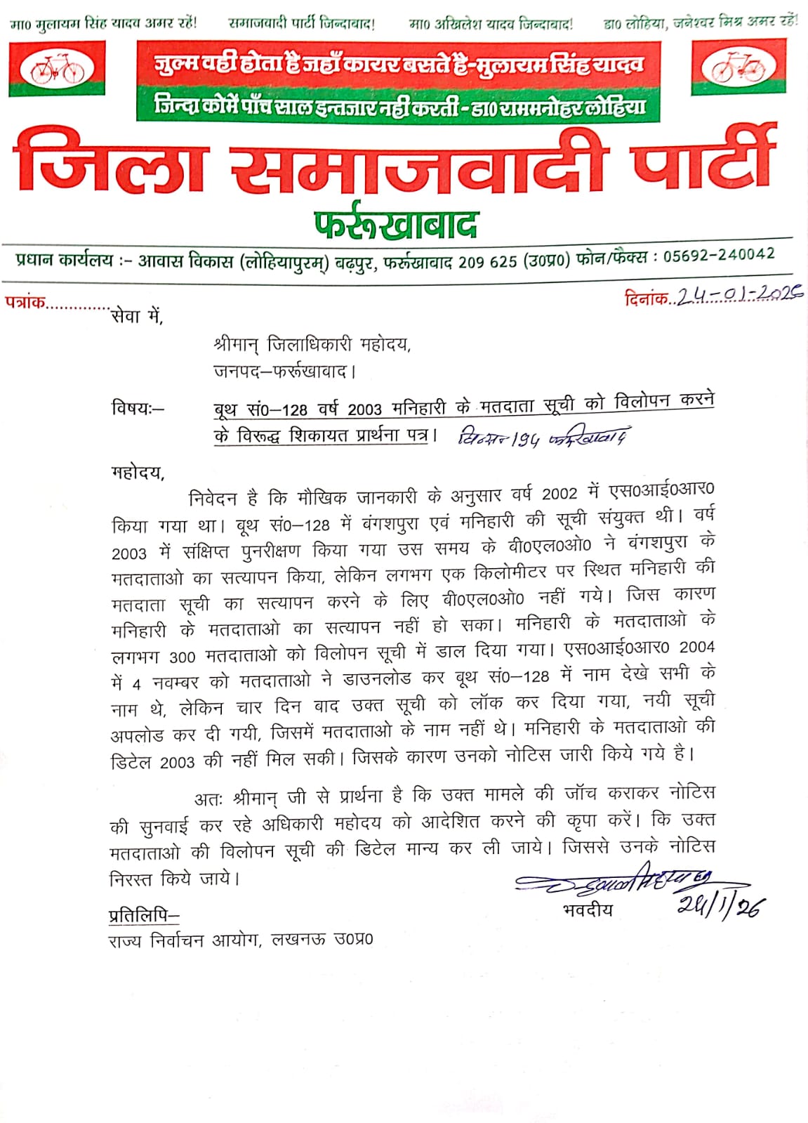 सौंपे गए मांग पत्र में सपा नेताओं ने कहा है कि सदर विधानसभा के मनिहारी मोहल्ला बूथ संख्या 128 के 300 मतदाता विलोपन सूची में डाल दिए गए हैं, जबकि वह सभी मतदाता वैध हैं और सरकारी तंत्र की कमियों की वजह से उन लोगों का मताधिकार छीना जा रहा है, सपा नेताओं ने मांग की उपरोक्त मामले में जांच करवाकर नोटिस की सुनवाई कर रहे अधिकारी को जिला प्रशासन आदेशित करे, कि उक्त मतदाताओं की विलोपन सूची की डिटेल मान्य कर ली जाए जिससे उनके नोटिस निरस्त किए जा सकें।