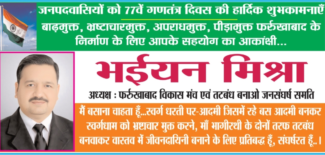 फर्रुखाबाद विकास मंच व तटबंध बनाओ जन संघर्ष समिति के जिलाध्यक्ष भईयन मिश्रा ने जनपदवासियों को 77 वें गणतंत्र दिवस की हार्दिक बधाई एवं शुभकामनाएं देते हुए कहा…….